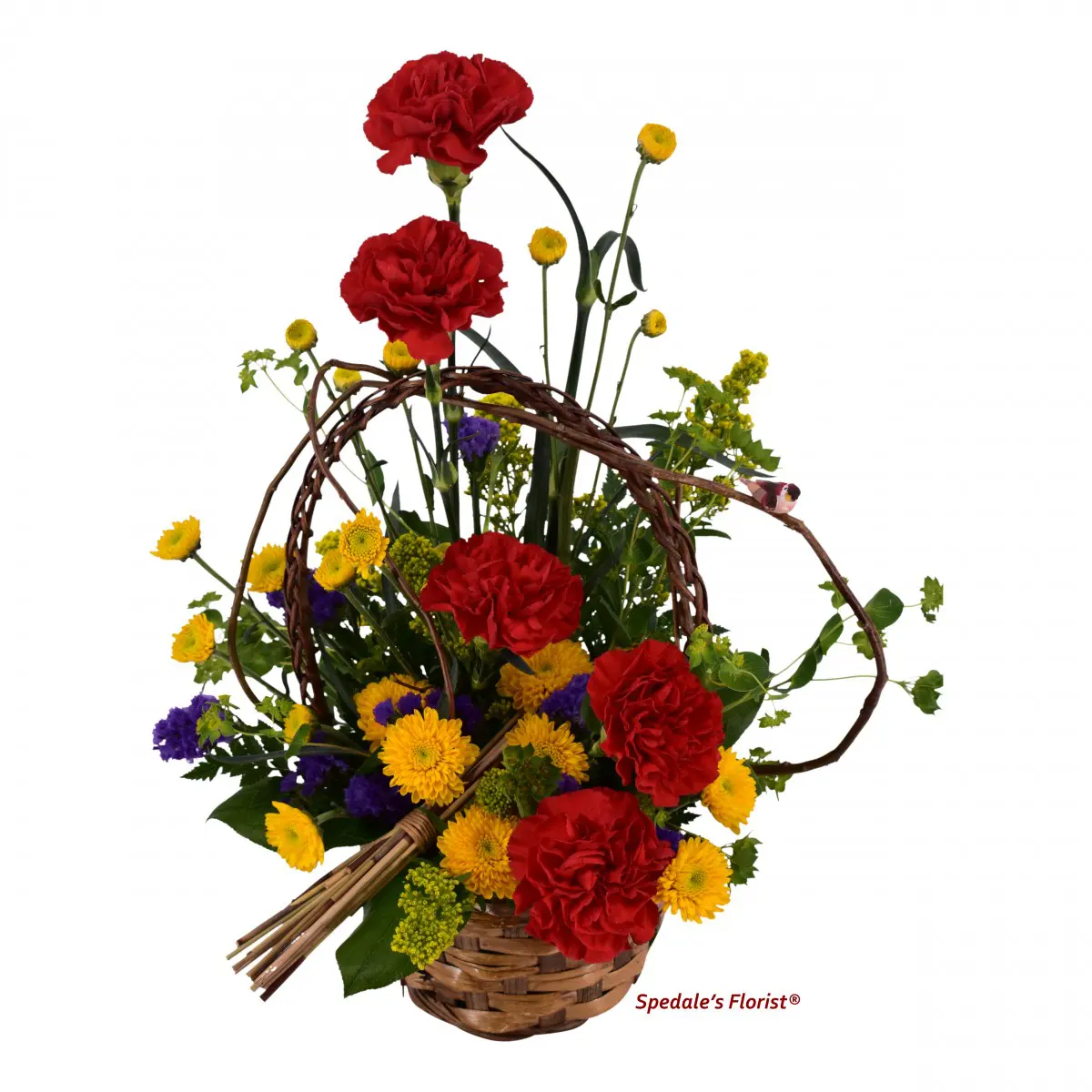 Bright and colorful mix of red carnations, poms, buplerum and other filler and greens in a brown handled basket with curly willow vines. Measures approximately 14″ tall and 10″ wide. Basket may vary based on availability.