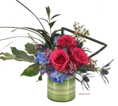 Araceli is so simple yet so eye catching. The hot pink roses pop against the blue hydrangea. The blue thistle adds a little flare along with the assortment of greenery. The container may vary depending on availabalility. Flowers are substituted as needed to ensure the best quality possible. Dimensions : 6x7x5