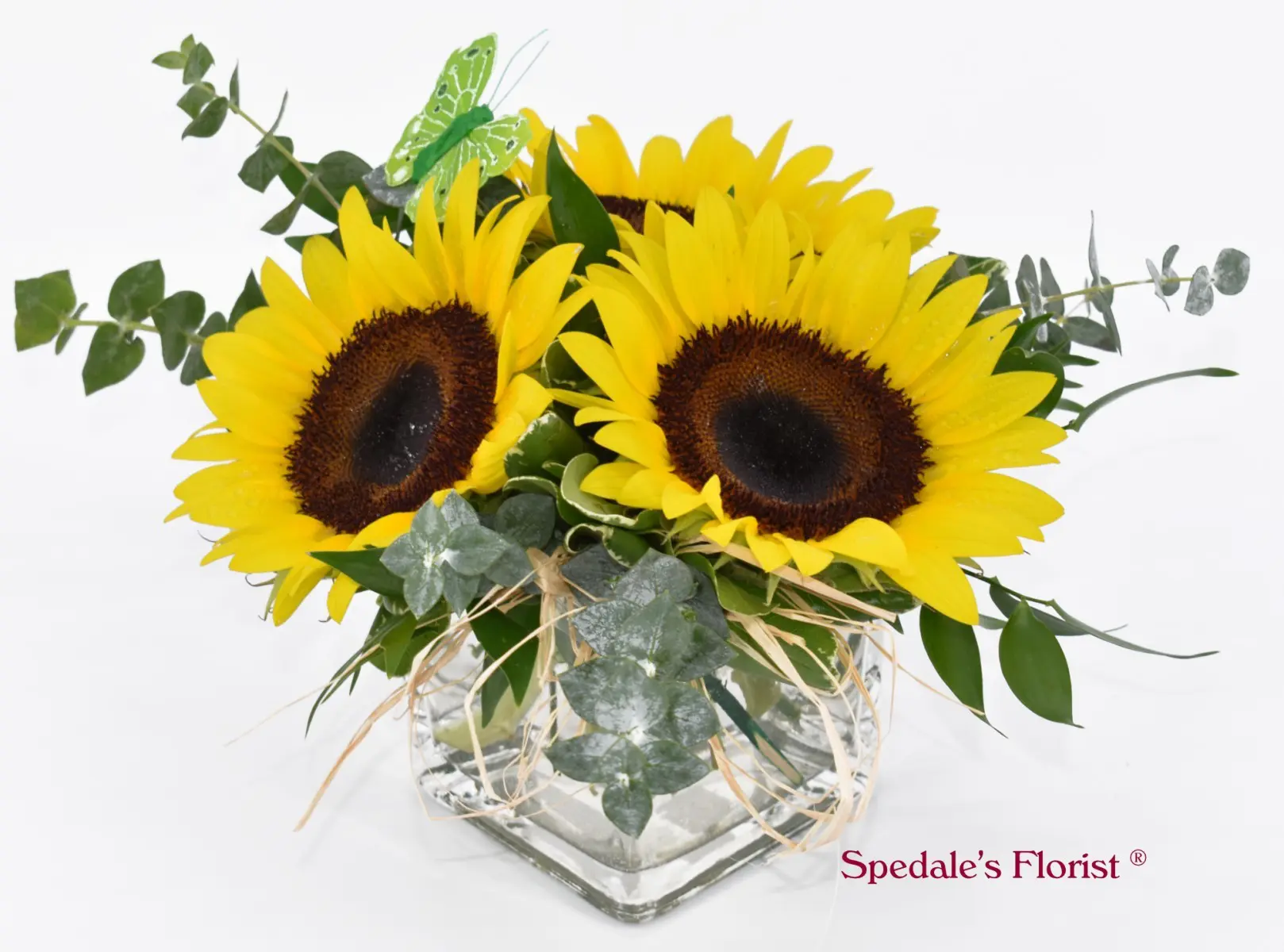 Three sunflowers in a 4″ glass cube, accented with a butterfly and seasonal greens. Raffia tucks ads a nice touch.