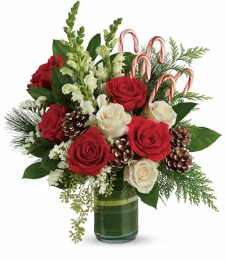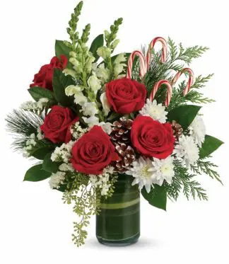 Red roses, with snapdragons, and white cushion chrysanthemums are wrapped in a variegated aspidistra leaf and accented with seeded eucalyptus, cedar, pine, and various greens, candy canes, and small frosted pinecones. Delivered in a clear glass cylinder vase. Approximately 16″ Wide x 17 1/2″ High. Greens may vary depending on availability.