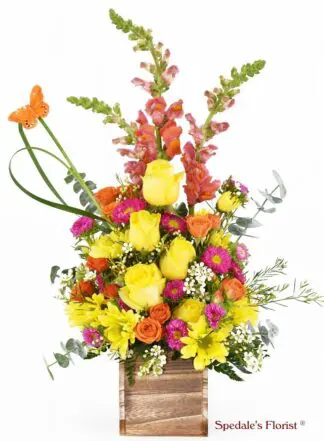 One of our Best Sellers! Roses, petite roses, snapdragon, and asters happily arranged in a genuine wooden container. The wood container may vary between a brown wood tone or a grey wood tone depending on availability. Filler flowers may vary due to availability.