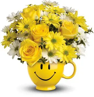 When you’re looking to make someone smile, this happy face mug of roses and daisies is tops. Sure to cheer up everyone from a beloved wife to a busy boss, these are also great flowers for kids.