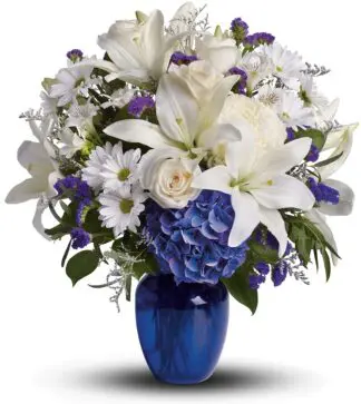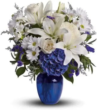 This beautiful bouquet pairs pure white flowers with deep blue blooms in a gorgeous blue glass vase. (BLUE VASE MAY VARY IN SHADES DEPENDING ON AVAILABILITY)