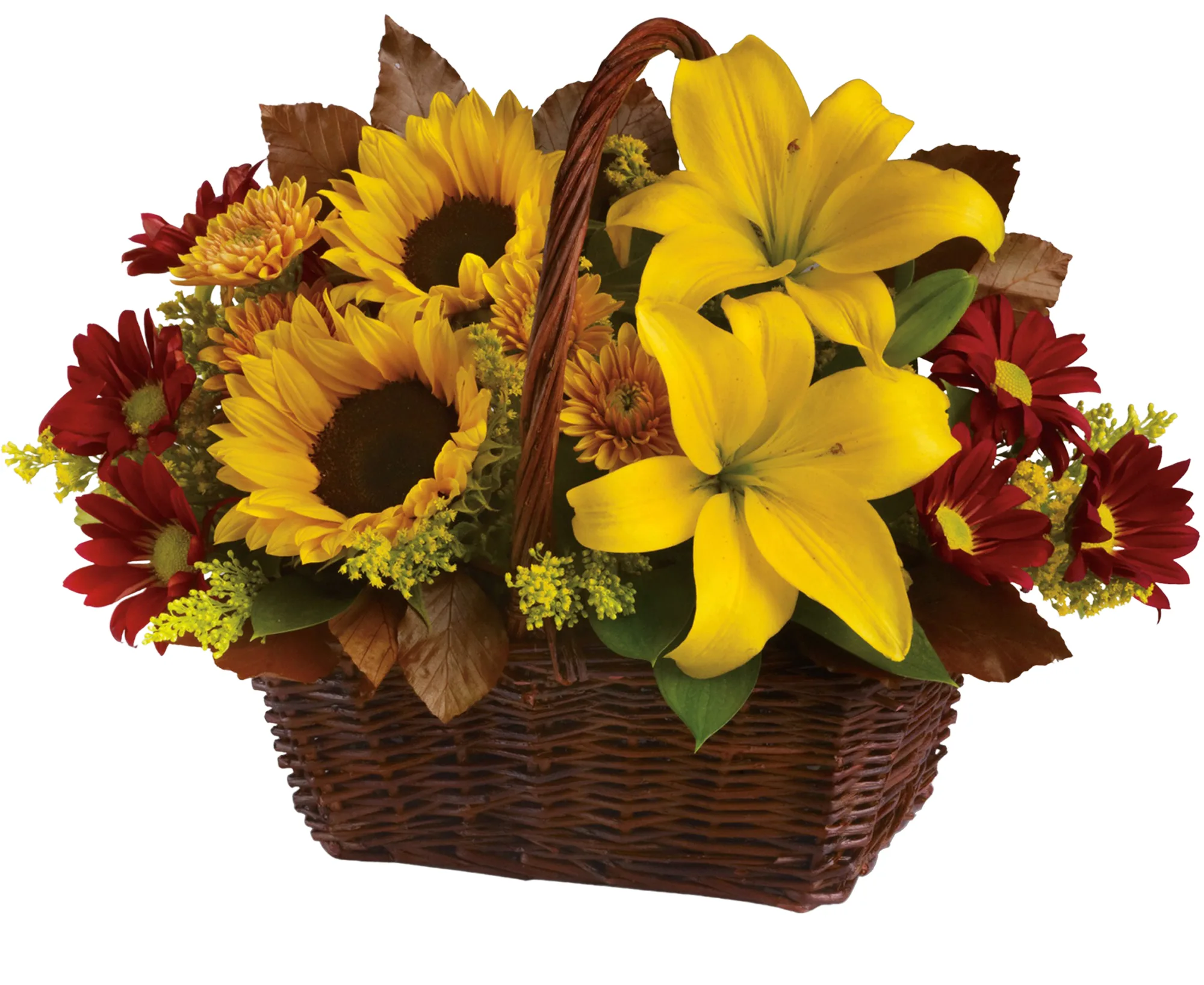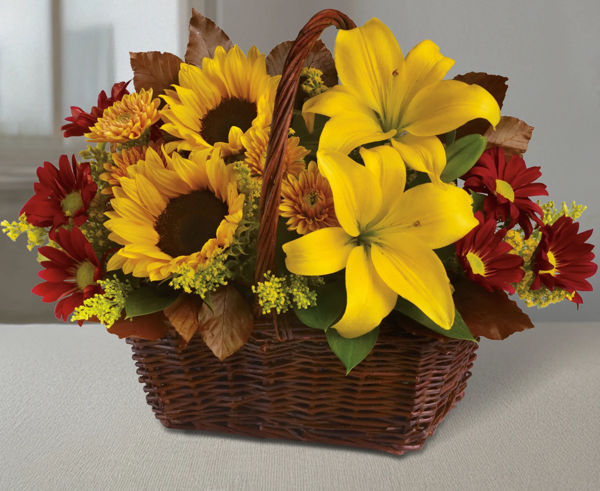 Welcome the fall season with this charming basket of fresh fall flowers. Sunflowers, Lilies, and assorted seasonal flowers will brighten their day.