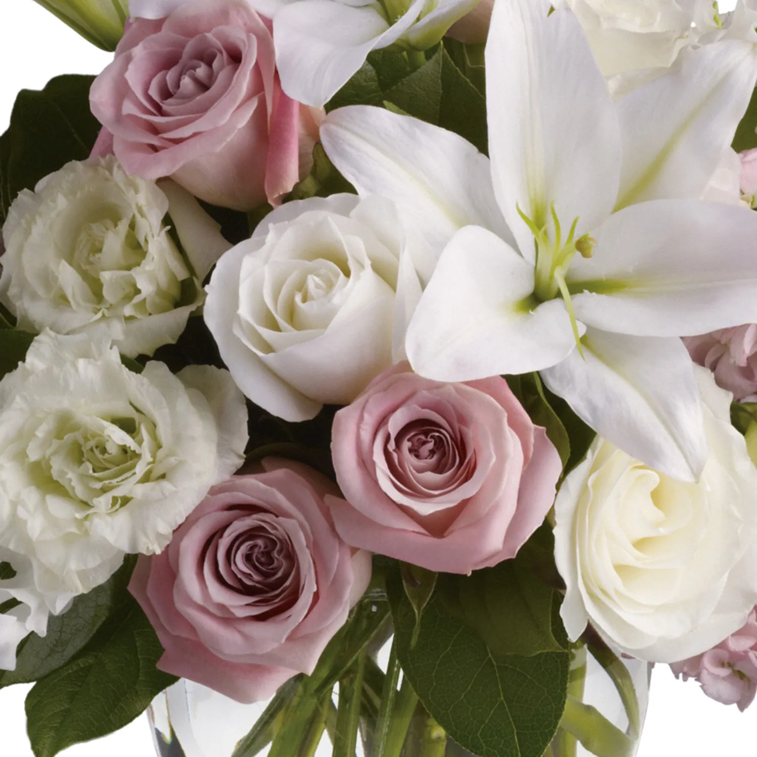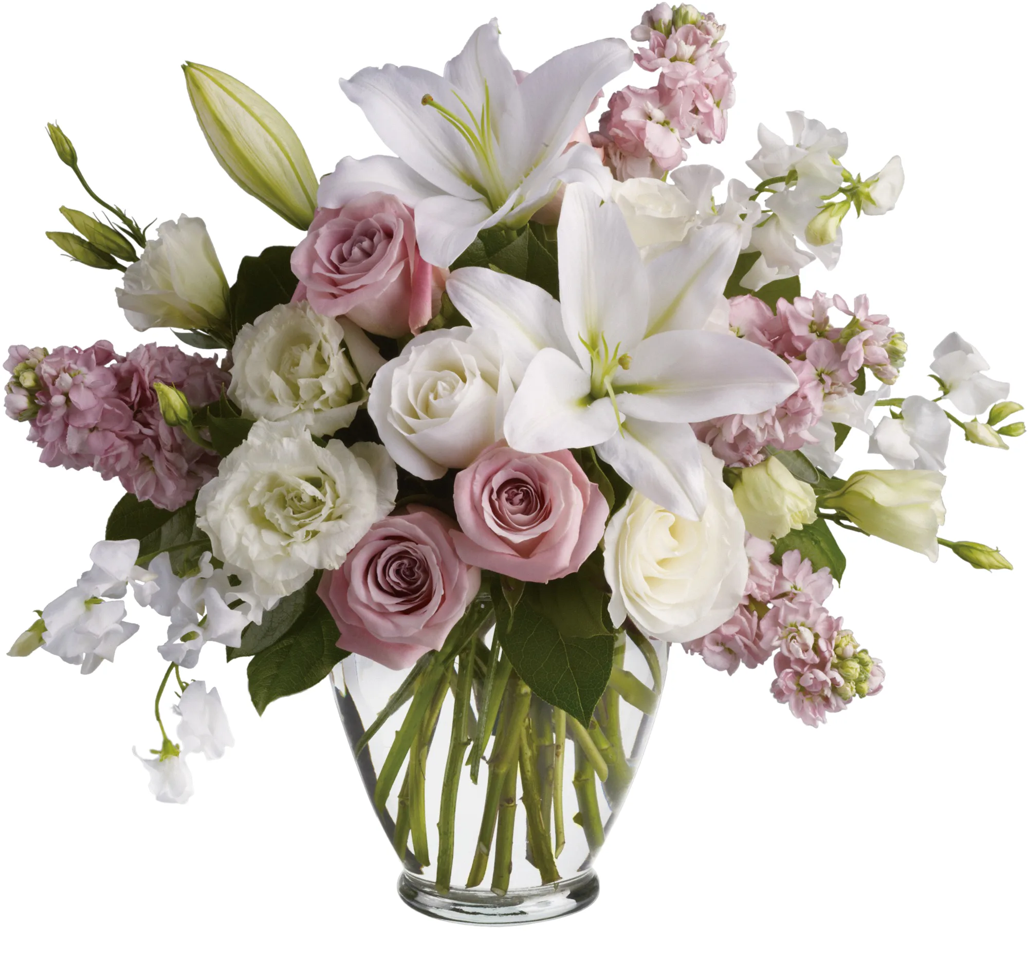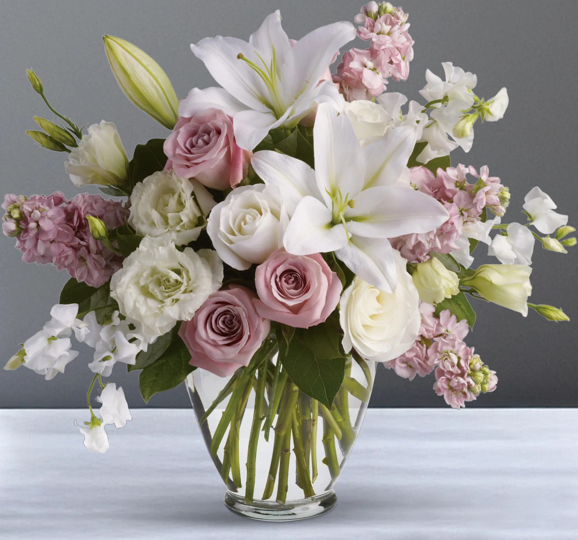 Gorgeous, gorgeous, gorgeous! This lush natural arrangement of royal roses, lilies, lisianthus, sweet pea and stock is stunning in its variety and color palette. Not to mention its fabulous fragrance!