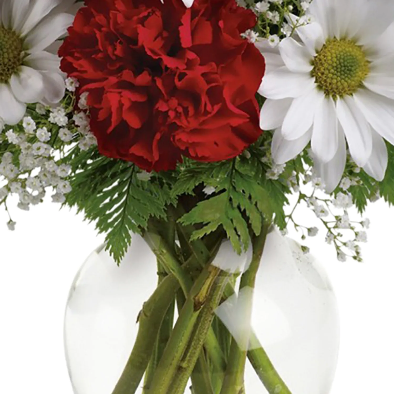 Red carnations, red miniature carnations, white daisy spray chrysanthemums, baby’s breath and leatherleaf fern. Delivered in a spring garden vase.