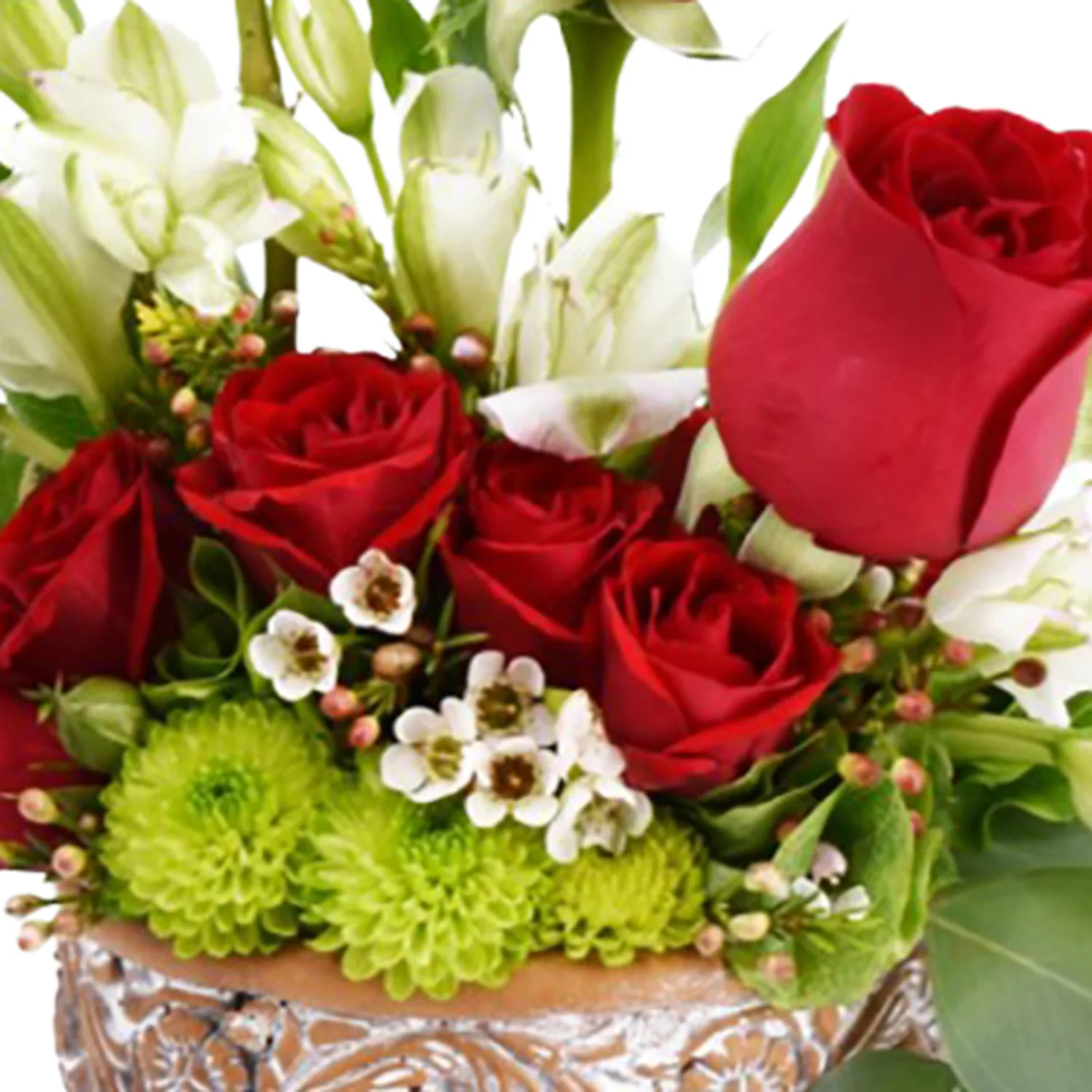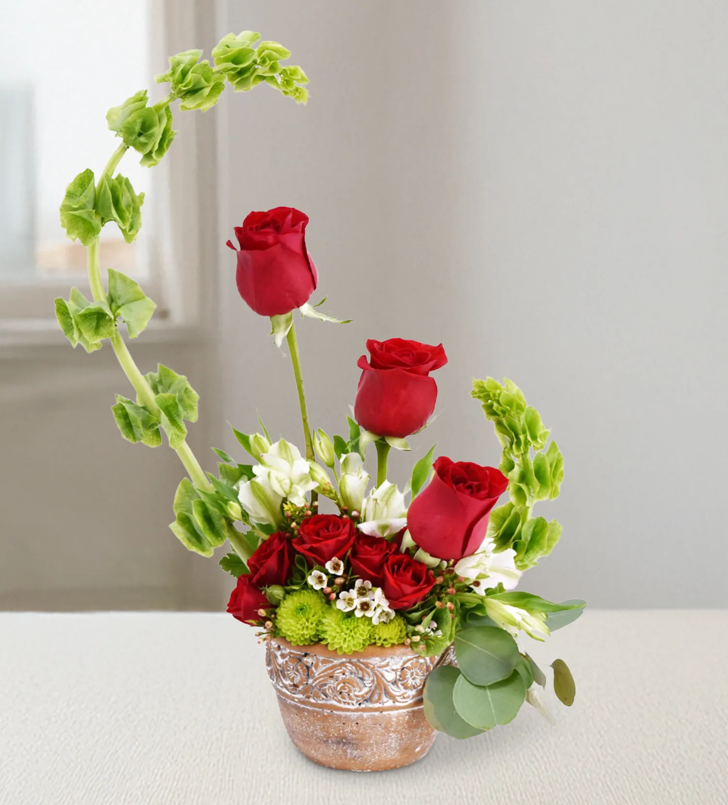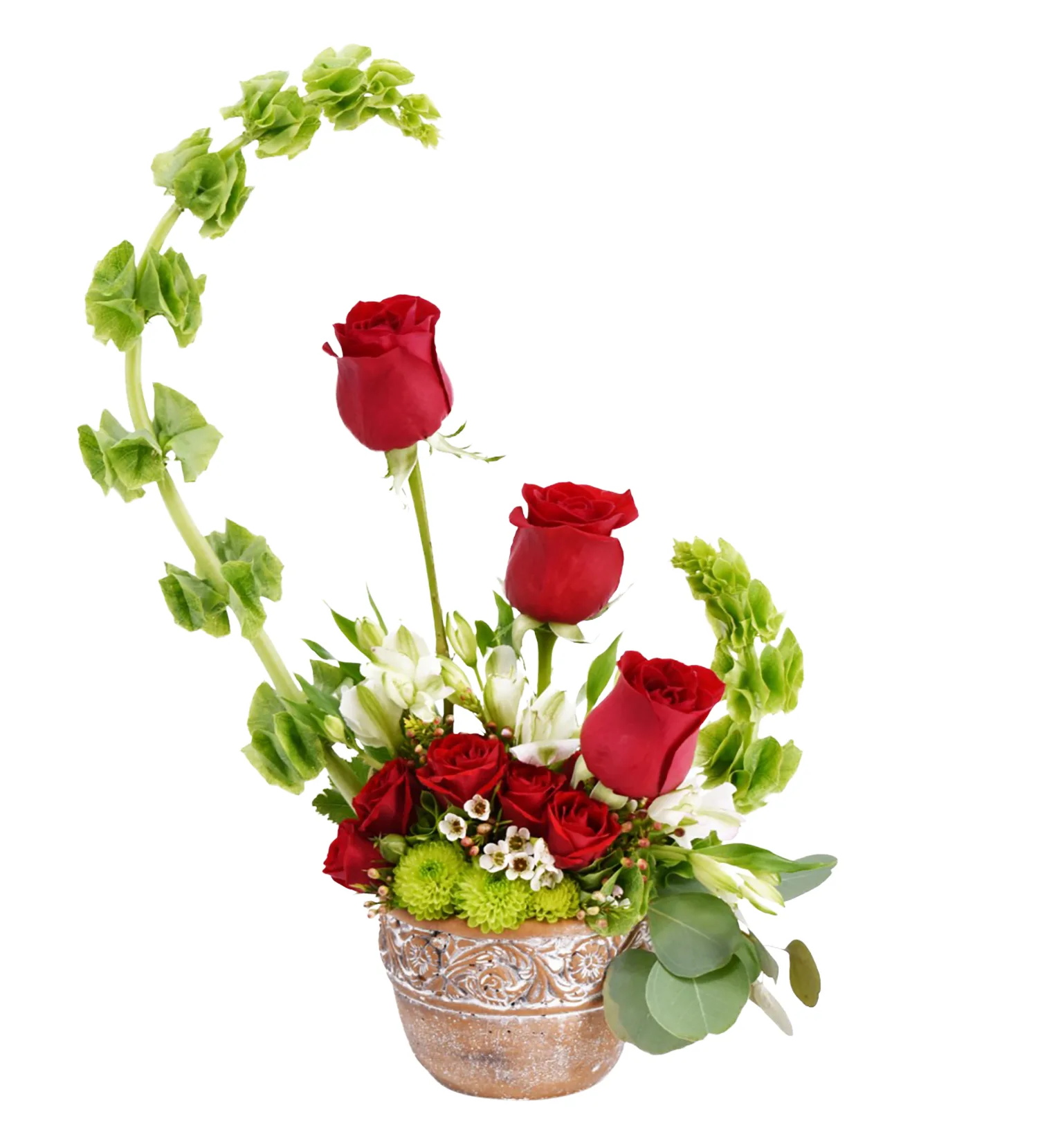 3 red roses with bells of ireland, spray roses, fillers, in a ceramic container.  Container and fillers may vary due to availability.