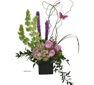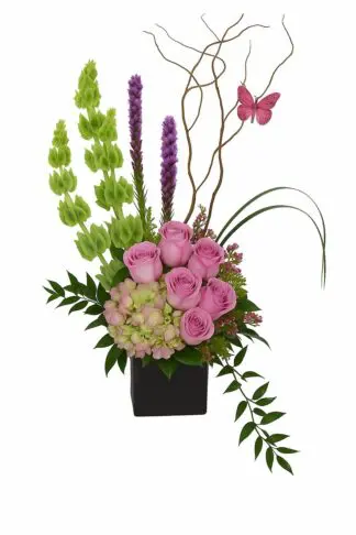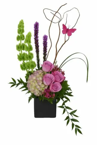 Beautiful architectural floral design featuring Bells of Ireland, Hydrangea, Roses, Liatris and assorted seasonal greens.