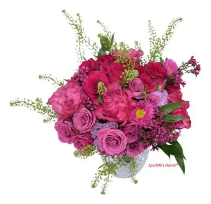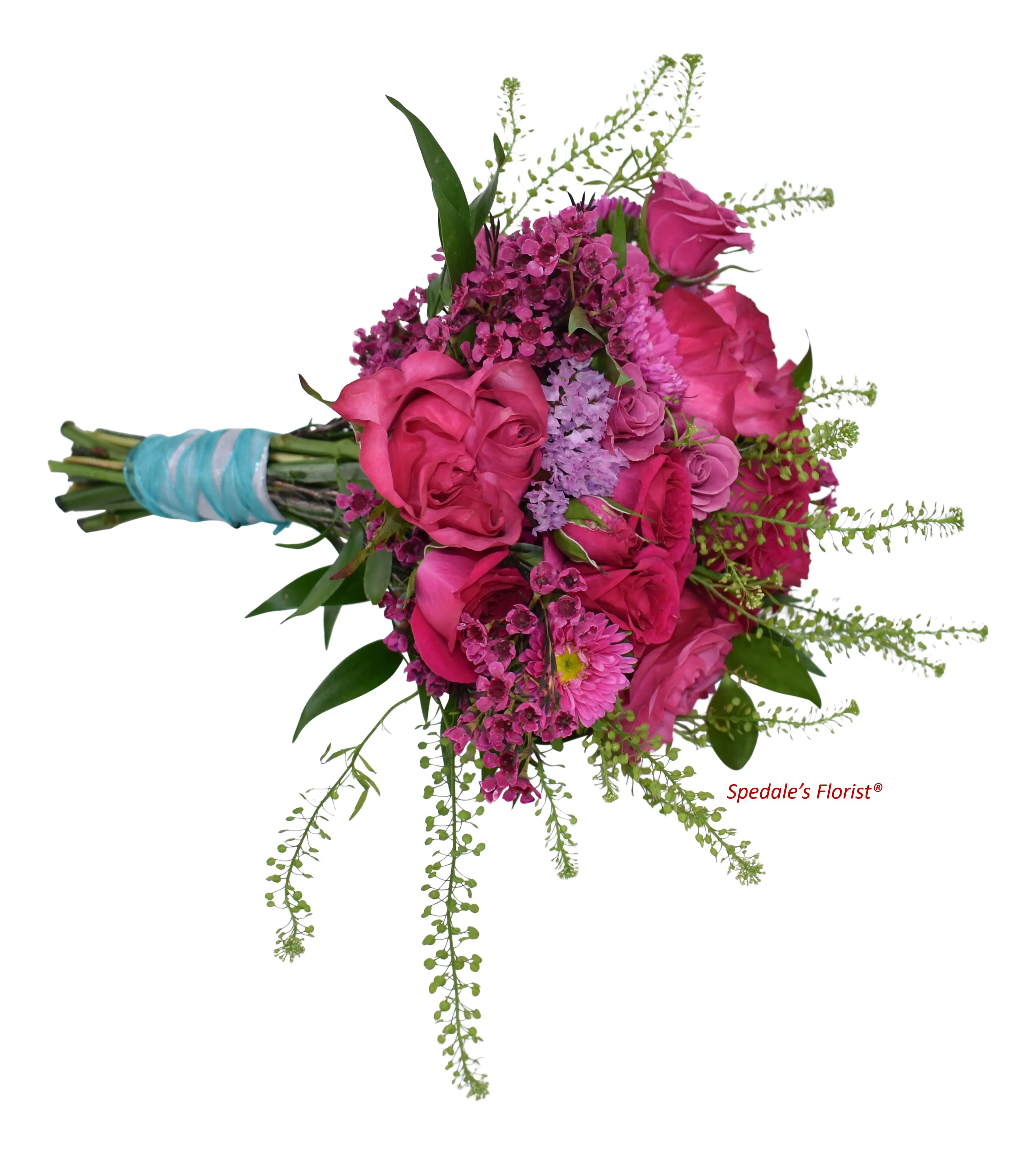 Garden roses with an assortment of waxflower, statice, spray roses, and eucalyptus designed in a textural style with ribbon wrapped stems.