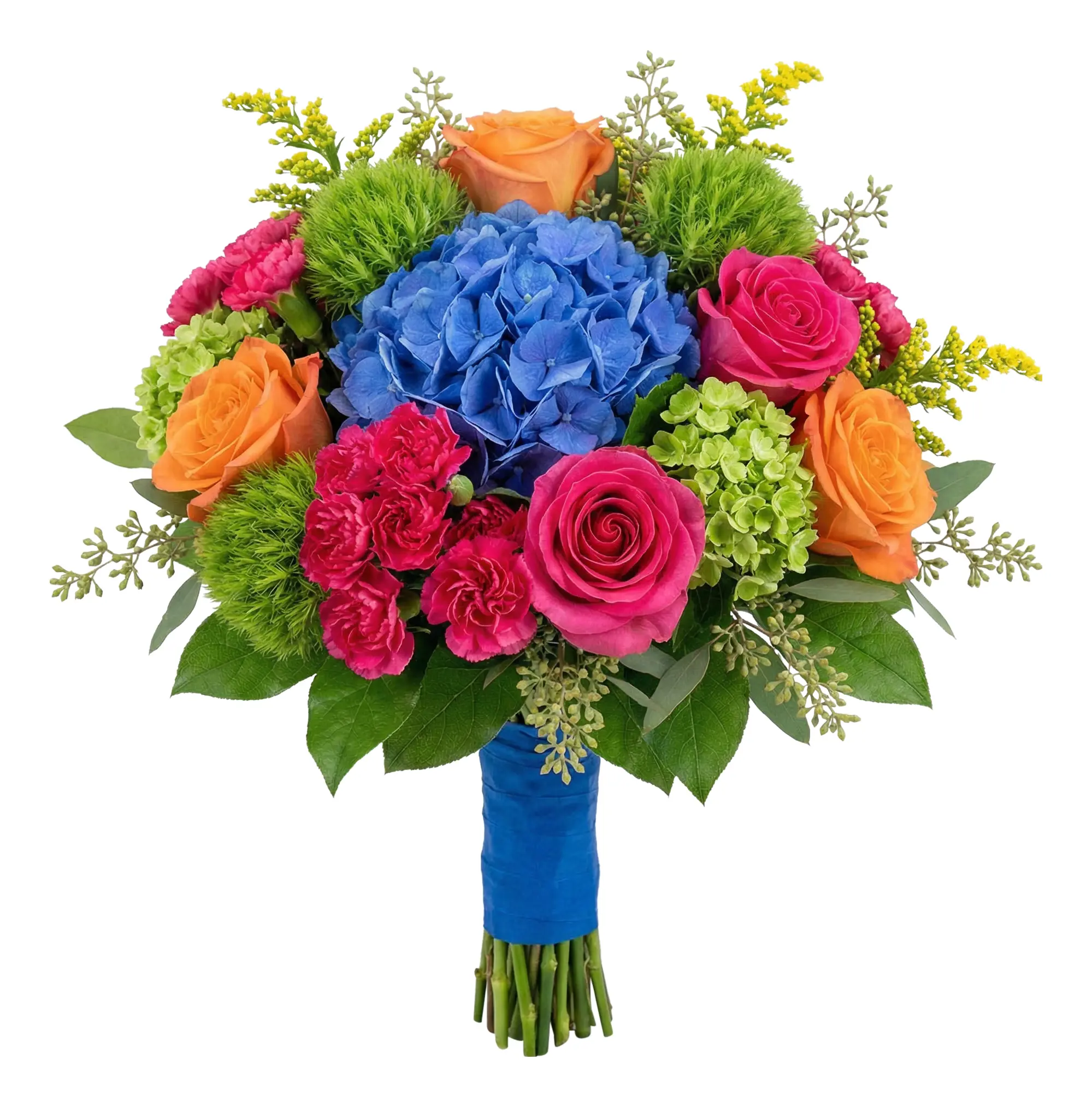 Vibrant and fresh mix of shocking blue hydrangea, mini green hydrangea, orange roses, hot pink roses, green trick dianthus, solidago, seeded eucalyptus, and hot pink miniature carnations. Royal blue stem wrap