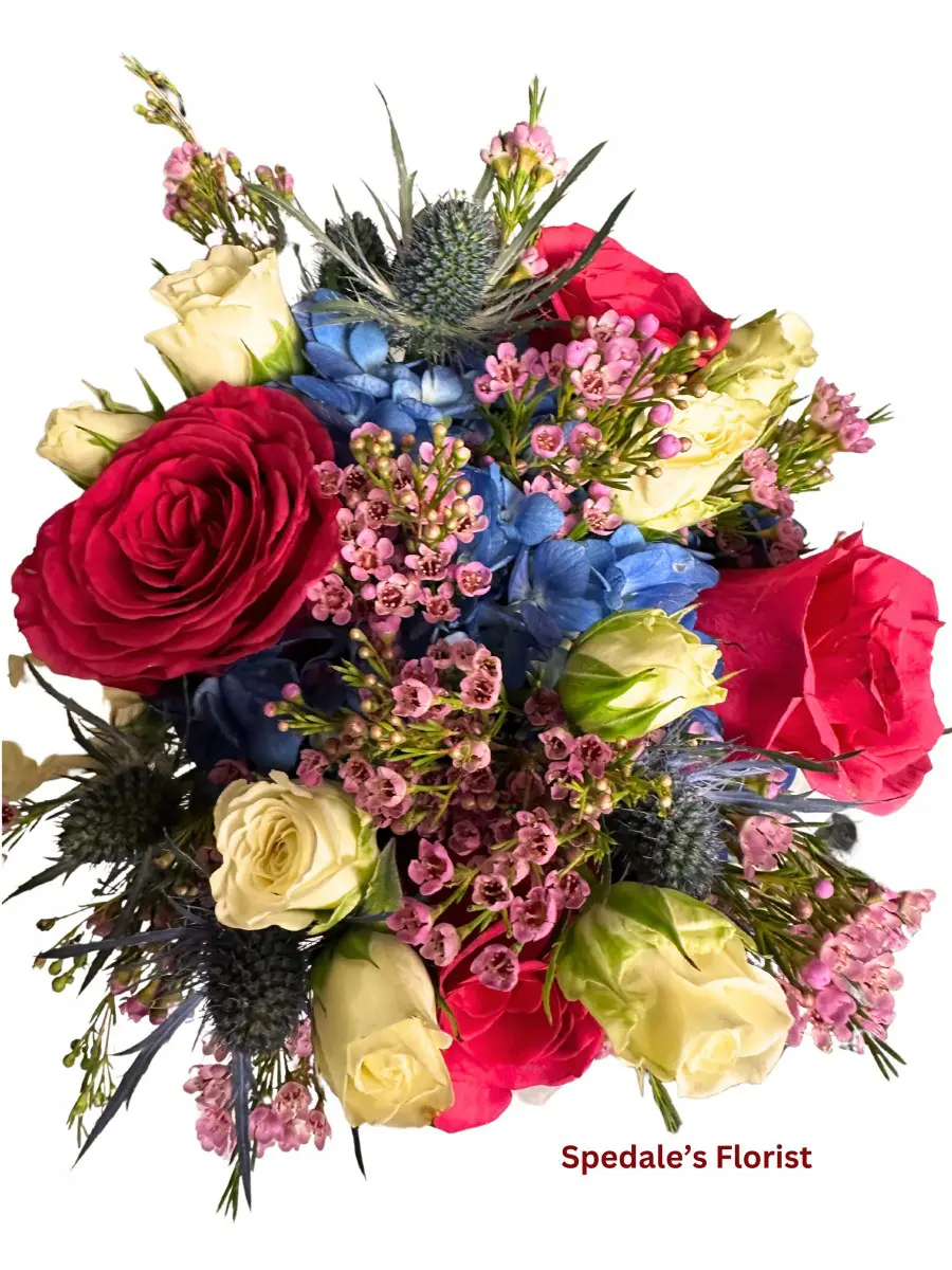Blue Hydrangea, Thistle, Hot Pink Roses, White spray rose Nosegay, ribbon wrapped.