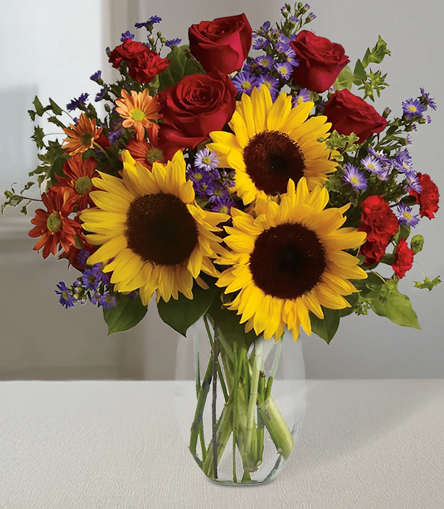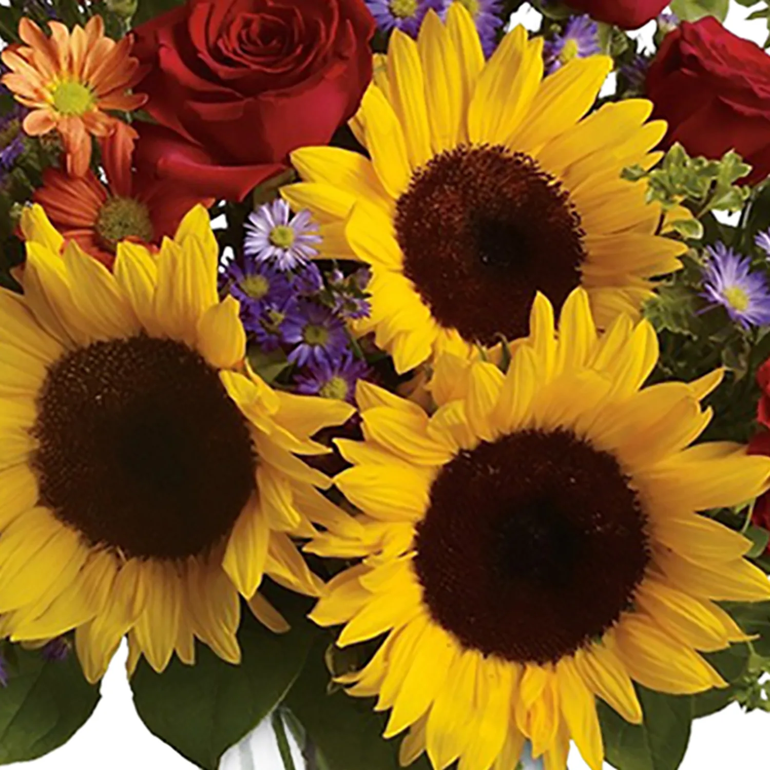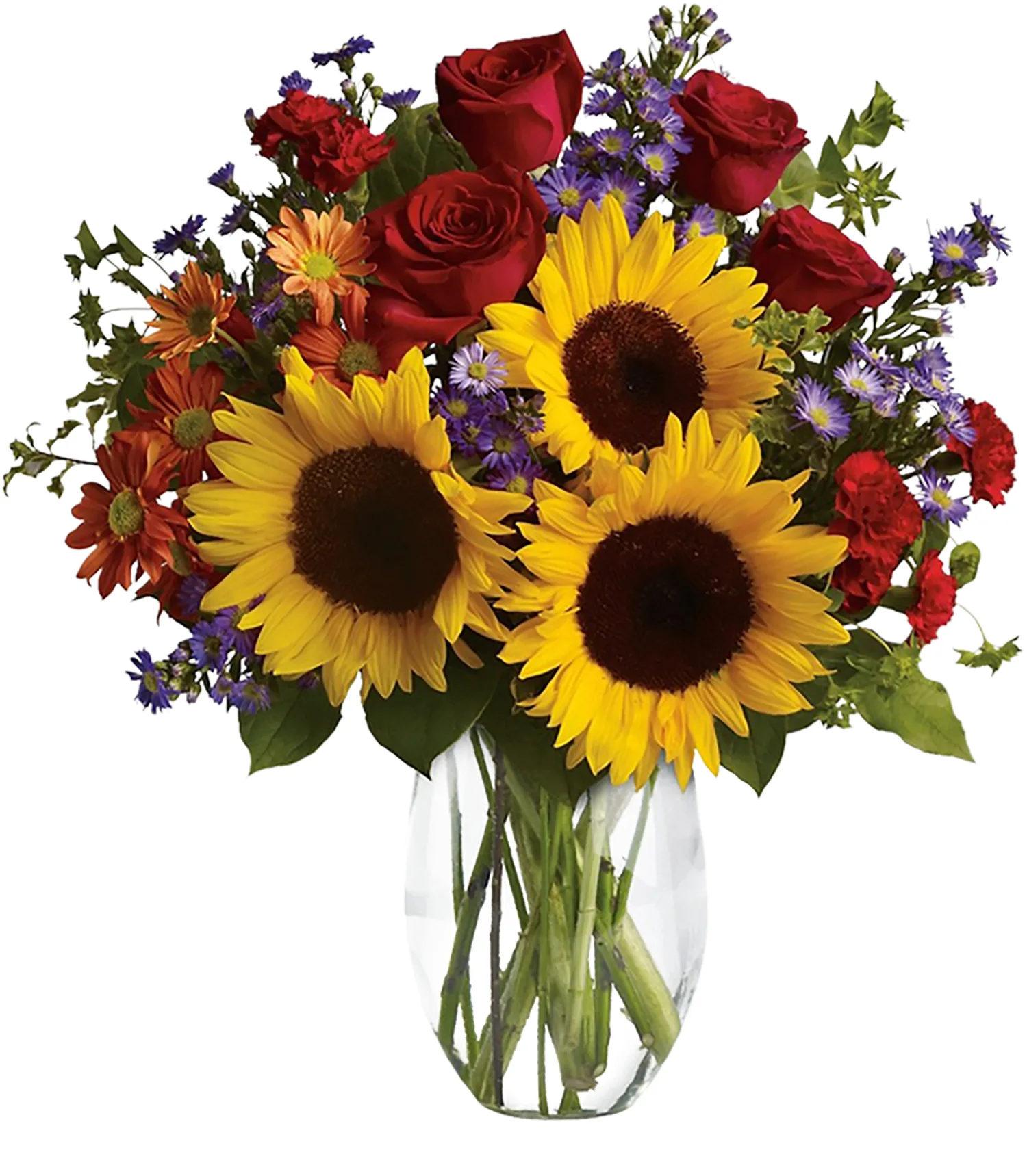Bold red roses and stunning sunflowers are mixed with miniature red carnations, bronze daisies and lavender monte cassino asters. Arranged with assorted foliages in a clear glass vase. Vase may vary.