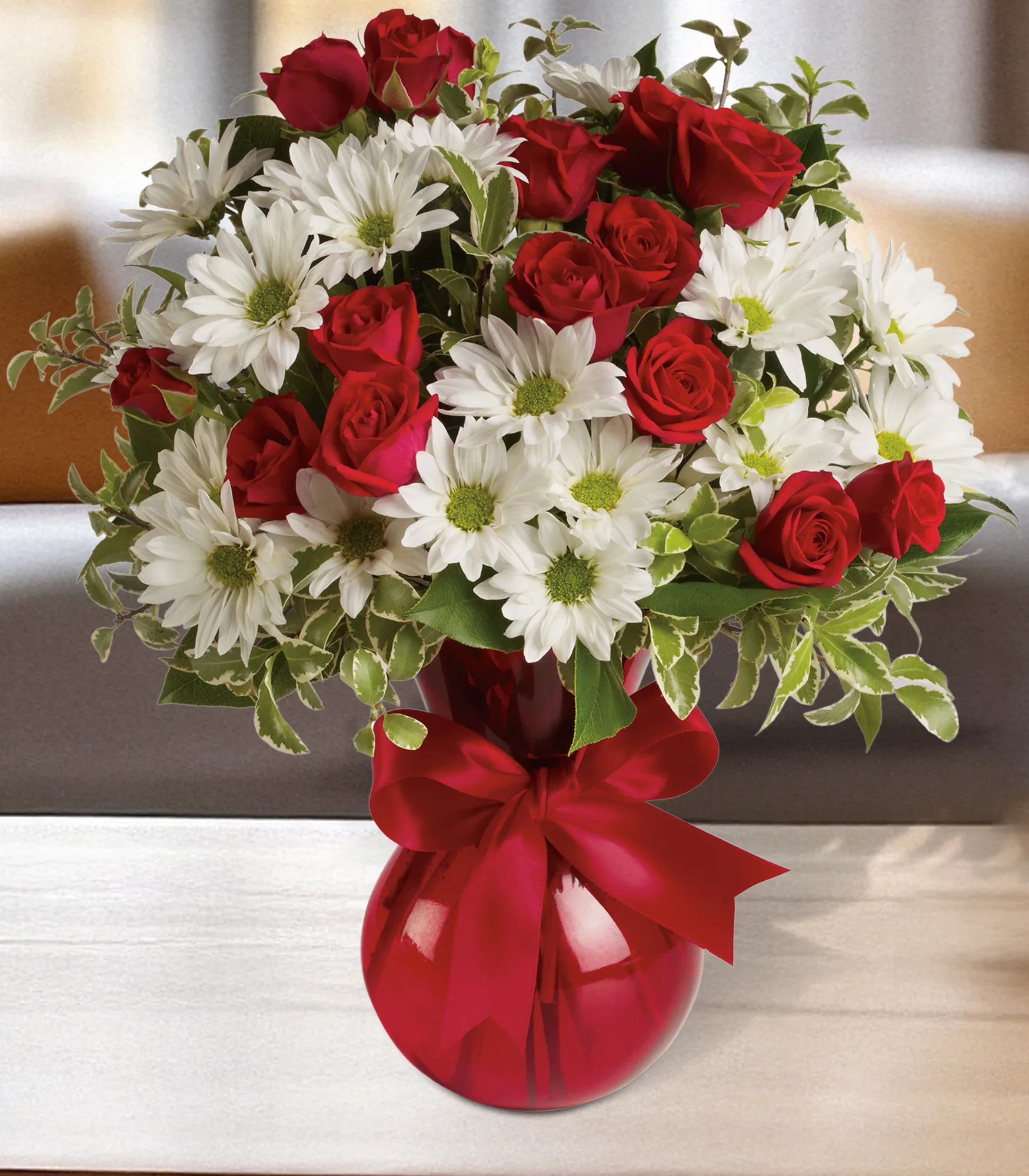 Fly your colors! A festive red ribbon wraps up this sweet bouquet of red roses and white daisies. This loving gift is presented in our shapely red vase your special someone will adore all year long.