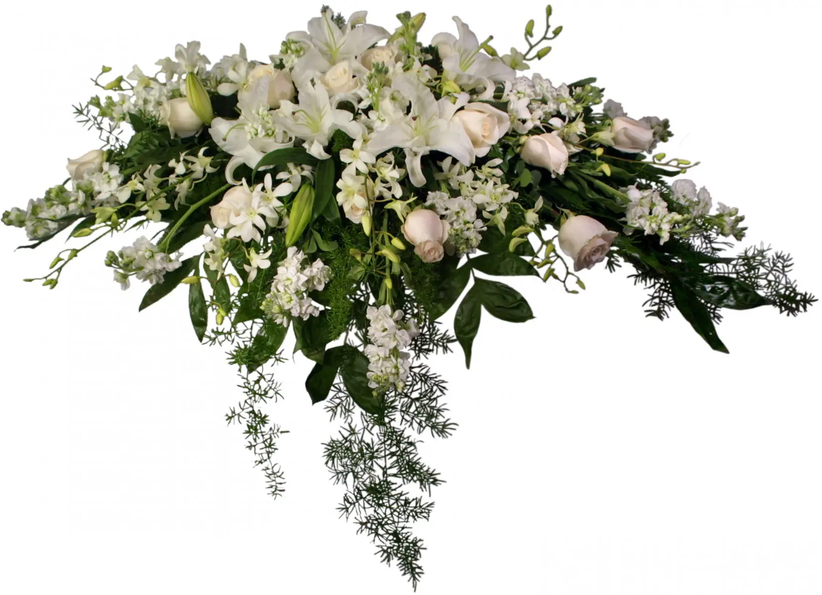 Flowing all white casket spray