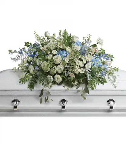 As soft and delicate as a tender remembrance, this stunning spray of sky blue hydrangea and pure white roses brings a fresh, natural beauty to the casket.
