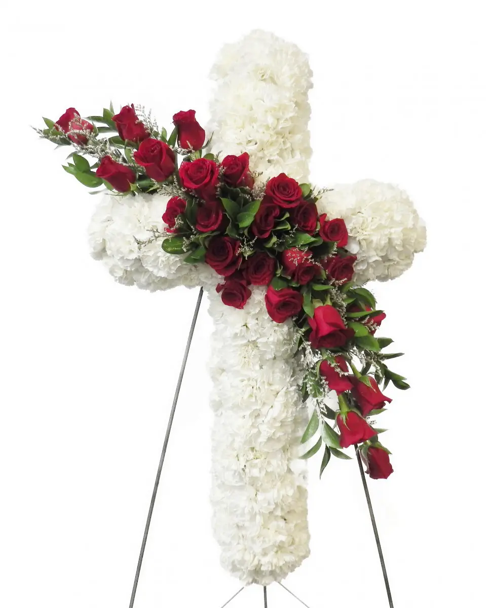 This special tribute cross is designed entirely of fresh flowers with a drape of red roses