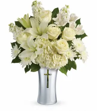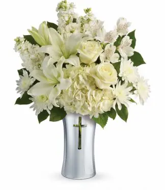 Show your sympathy with style and grace. A shining silver finish and reverent cross cut-out makes this stunning ceramic vase the perfect accompaniment for a lush bouquet of pure white hydrangea, lilies, alstroemeria and stock. White hydrangea, white asiatic lilies, white alstroemeria, white stock, and white cushion spray chrysanthemums are accented with lemon leaf.