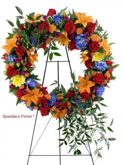 A wonderful tribute to a loved one with this Regal, bold colored wreath. Roses, Hydrangea, Asiatic Lilies, and various seasonal flowers and greens on a 22″ wreath. Flower substitutions may vary due to season and availability.
