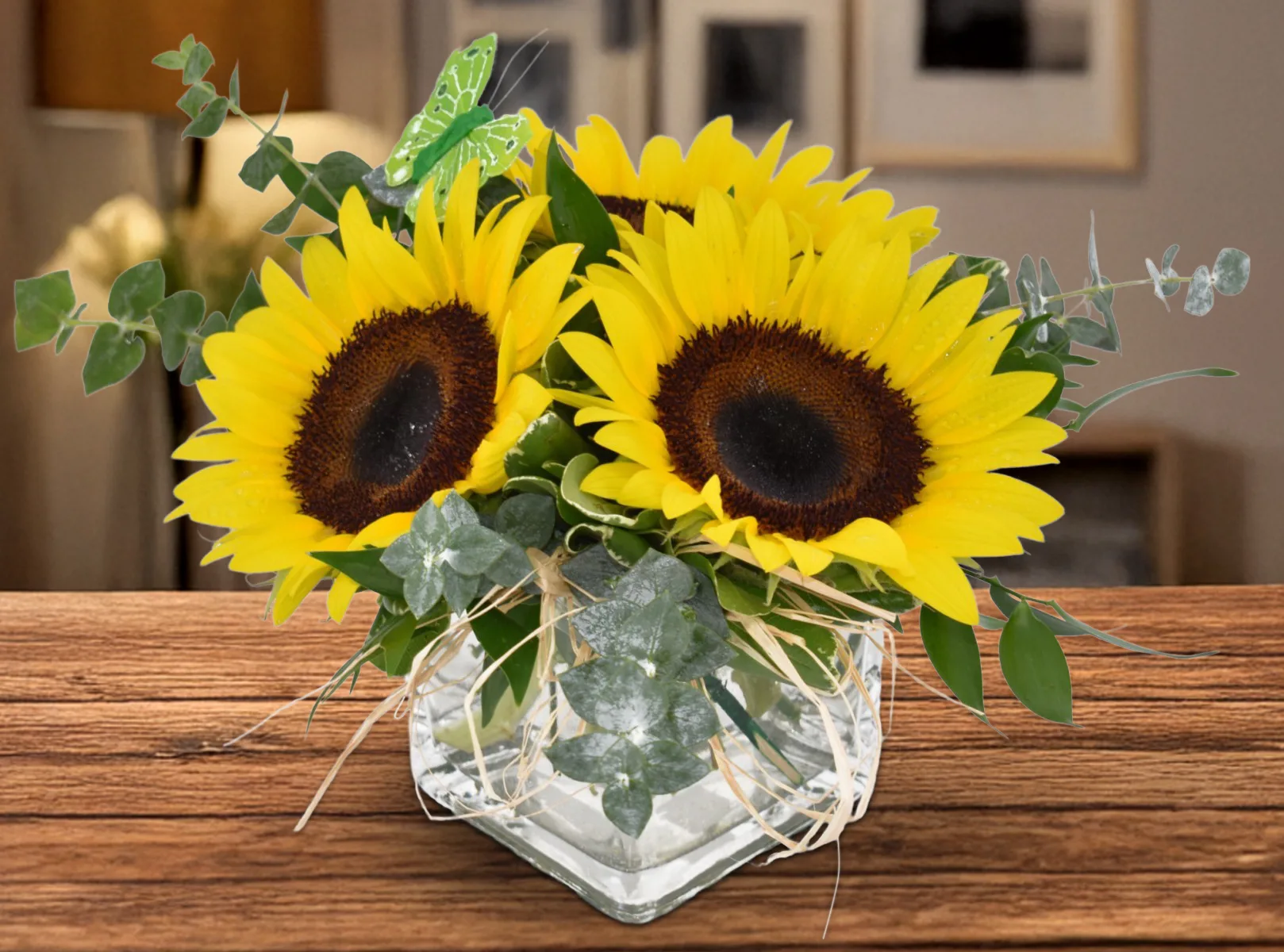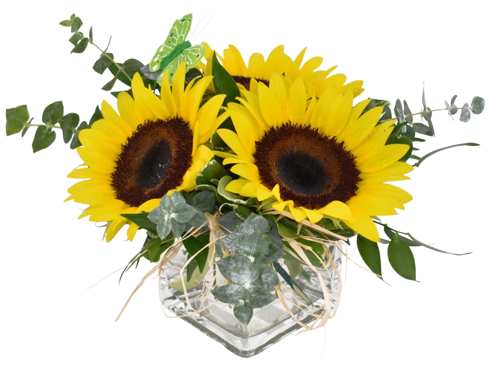 Three sunflowers in a 4″ glass cube, accented with a butterfly and seasonal greens. Raffia tucks ads a nice touch.